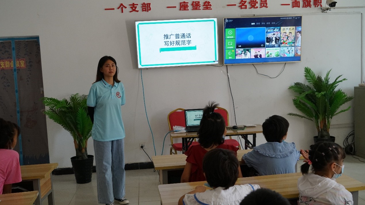 服务队分别面向村民、小学生开展了4场国家通用语言学习培训。队员们简要介绍学习国家通用语言的重要意义,结合实例演示学习国家通用语言的常用方法,带领学习简短对话、朗读短句,并通过绕口令、词语接龙等游戏,让大家感受国家通用语言文字的魅力,进一步增强学习国家通用语言的热情。在服务队的带动、鼓励下,小朋友们还饶有兴致地齐声背诵了《三字经》片段、唐诗等,展示了中华传统文化的学习成果。
