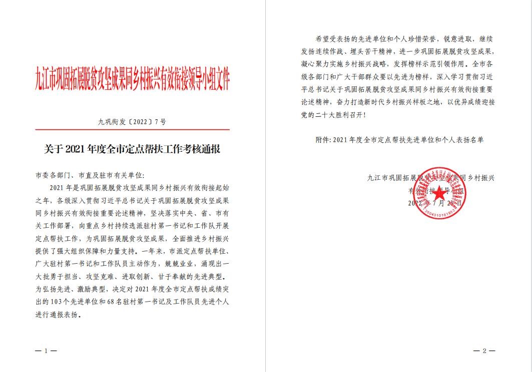 近日,九江市巩固拓展脱贫攻坚成果同乡村振兴有效衔接领导小组下发《关于 2021 年度全市定点帮扶工作考核通报》(九巩衔发〔2022〕7 号)文件,对扎实推进定点帮扶工作,在巩固拓展脱贫攻坚成果,全面推进乡村振兴领域作出突出成绩的单位进行表彰。bat365在2021年度九江市定点帮扶和驻村工作考核中获评先进单位,吕恺帆同志荣获先进个人。