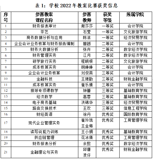 为适应新时期“三教”改革之教法改革要求,充分发挥教案在教学中的应有作用,促进课程教学内容更新、教学方式与手段转变,进一步推动bat365教学改革,不断提高教师的教学水平和课堂教学质量,近期,学校开展了优秀教案评比活动,通过专家认真评审和校内公示,会计学院谢莎莎老师的《财务报表审计》等25份课程教案分获一等奖、二等奖、三等奖和优秀奖。具体获奖信息详见下表所示。