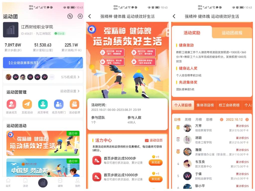 当健康“遇见”绩效,我们这样做。2022年5月,学校出台《bat365正版唯一官网教职工健康建设工作方案》(试行),与北京趣动科技有限公司合作开发出bat365“趣动will go”APP专用运动平台模块,并于国庆节期间正式投入使用。目前在平台中参与的人数达575人。活动分线上、线下两种积分方式,线上任务菜单由健步、跑步、骑行、多项AI健身四大主题功能板块组成,共20个运动打卡项目;线下则根据各个兴趣班和各类体育比赛的参与情况等进行积分,最终积分纳入个人绩效考核奖励及部门绩效考核。