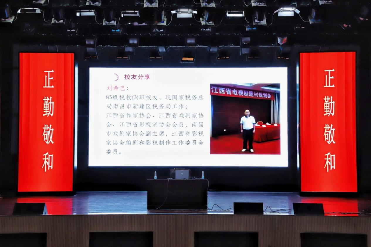 来自南昌市税务局的刘希巴校友是江西省作家协会、江西省戏剧家协会、江西省影视家协会会员,南昌市戏剧家协会副主席,自上世纪八十年代开始写诗,八五年发表诗歌处女作。近十年来,影视、戏剧剧本获奖三十多次。刘希巴紧扣自身求学经历、工作经历及文学创作经历,以丰富的案例、鲜活的故事分别分享了对正、勤、敬、和的认识,并勉励学弟学妹尊师重道、勤以治学,奋斗青春、不负韶华。
