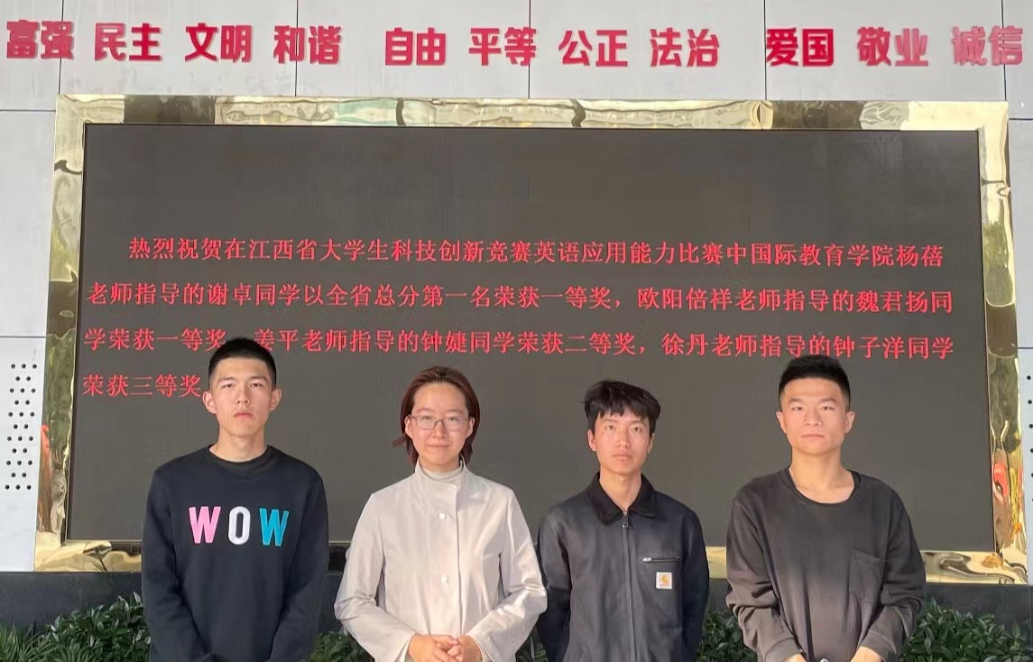 2022年11月6日,由江西省教育厅主办,江西科技师范大学、北京燕兴国际教育承办,江西省外语学会协办的江西省大学生科技创新竞赛英语应用能力赛项的决赛顺利完赛。bat365国际教育学院杨蓓、欧阳倍祥、姜平、徐丹四位老师指导的商务英语专业谢卓、魏君扬、钟婕、钟子洋4位选手荣获一等奖2项,二等奖1项,三等奖1项,其中谢卓同学夺得全省专科组总分第一名,杨蓓、欧阳倍祥两位老师获得“优秀指导教师”称号。bat365是专科组中获奖选手人数最多、成绩最好的院校。