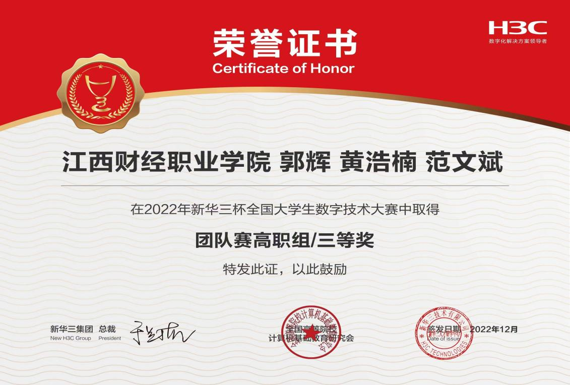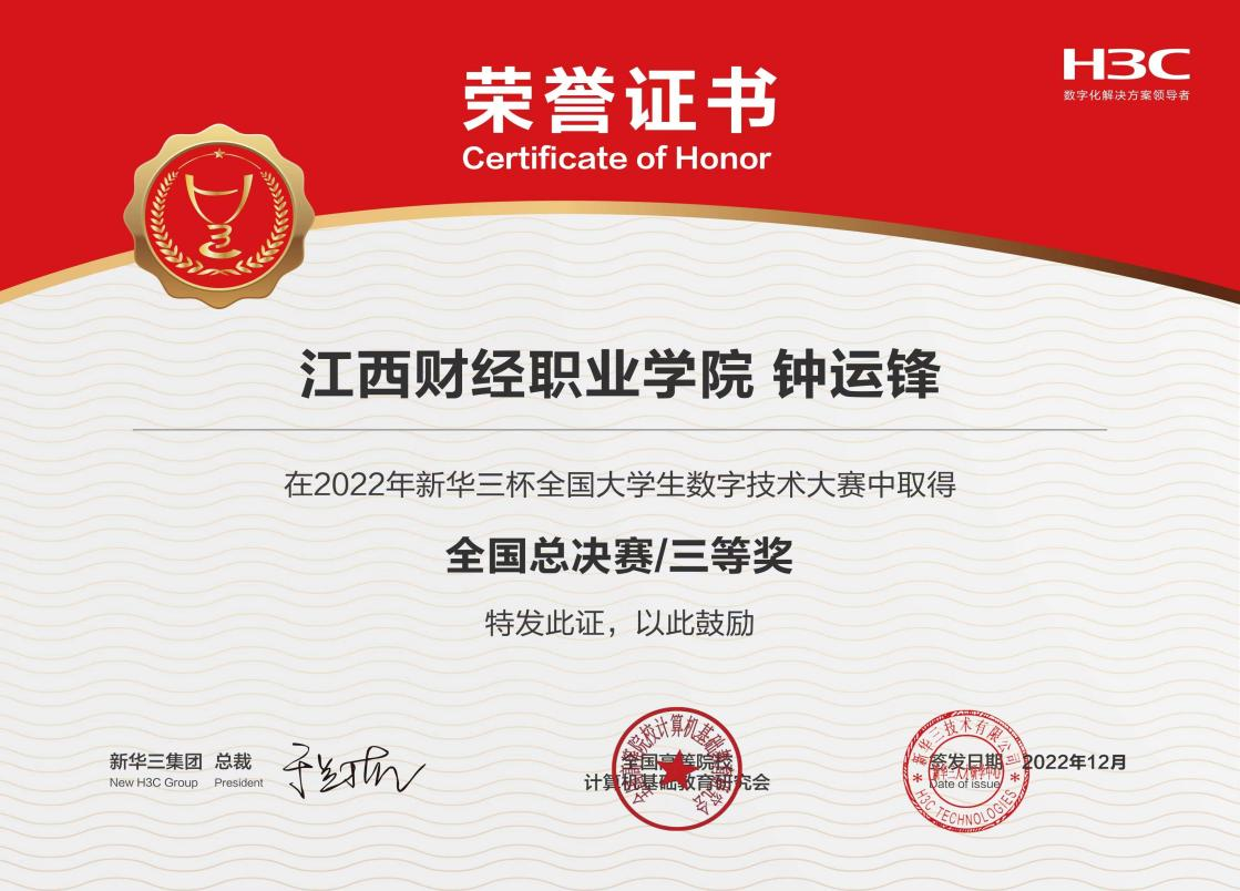 2022年第12届“新华三杯”全国大学生数字技术大赛全国总决赛于12月8日圆满落幕。本届大赛由紫光股份旗下新华三集团和全国高等院校计算机基础教育研究会联合主办,旨在推动学生、院校、企业三方互动,积极探索高科技技术人才培养思路,丰富多元化人才培养体系,建立良性的就业生态圈。经过激烈的角逐,bat365信息工程学院(鲲鹏产业学院)20级云计算技术与应用专业四名同学在经过江西赛区选拔后,以省赛一等奖的优异表现成功入围全国总决赛并全部获奖,团队赛中,由郭辉、黄浩楠、范文斌组成的队伍获得高职组三等奖;个人赛中,钟运峰获得三等奖。