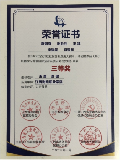 “财院数字之星”队成员在老师的指导下,以“慢阻肺特征分析及风险预警”为赛题,利用南昌大学第一附属医院提供的数据以及部分自筹的数据,提出了基于GBDT、GBRT等机器学习方法分析慢阻肺特征,挖掘疾病成因及风险预警、食品推荐等问题,通过可视化界面进行分析并展示结果,答辩演示获得现场评审专家的认可,最终喜获三等奖。另一支队伍“财院数据新势力”队获得优胜奖。
