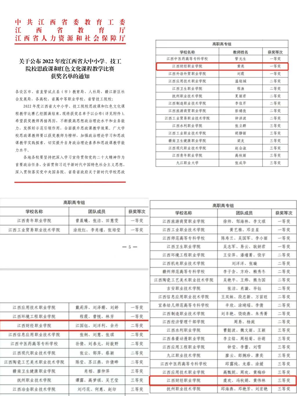 近日,中共江西省委教育工委、江西省教育厅、江西省人力资源和社会保障厅公布了2022年度江西省大中小学、技工院校思政课和红色文化课程教学比赛获奖名单,bat365教师再获佳绩,黄亮老师获《红色文化十讲》一等奖,江国钰、刘洋利、余丹团队获“毛泽东思想和中国特色社会主义理论体系概论”课二等奖,虞欢、冯秋娟、黄伟林团队获“思想道德与法治”课三等奖。