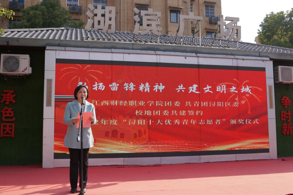 为贯彻落实习近平总书记对深入开展学雷锋活动作出的重要指示精神,校团委与共青团浔阳区委于3月6日在湖滨社区广场举行了校地团委结对共建签约暨2022年度“浔阳十大优秀青年志愿者”颁奖仪式。校党委副书记、校长彭慧出席并致辞,浔阳区委副书记查忠平、校党委委员刘锋等领导出席了此次活动。