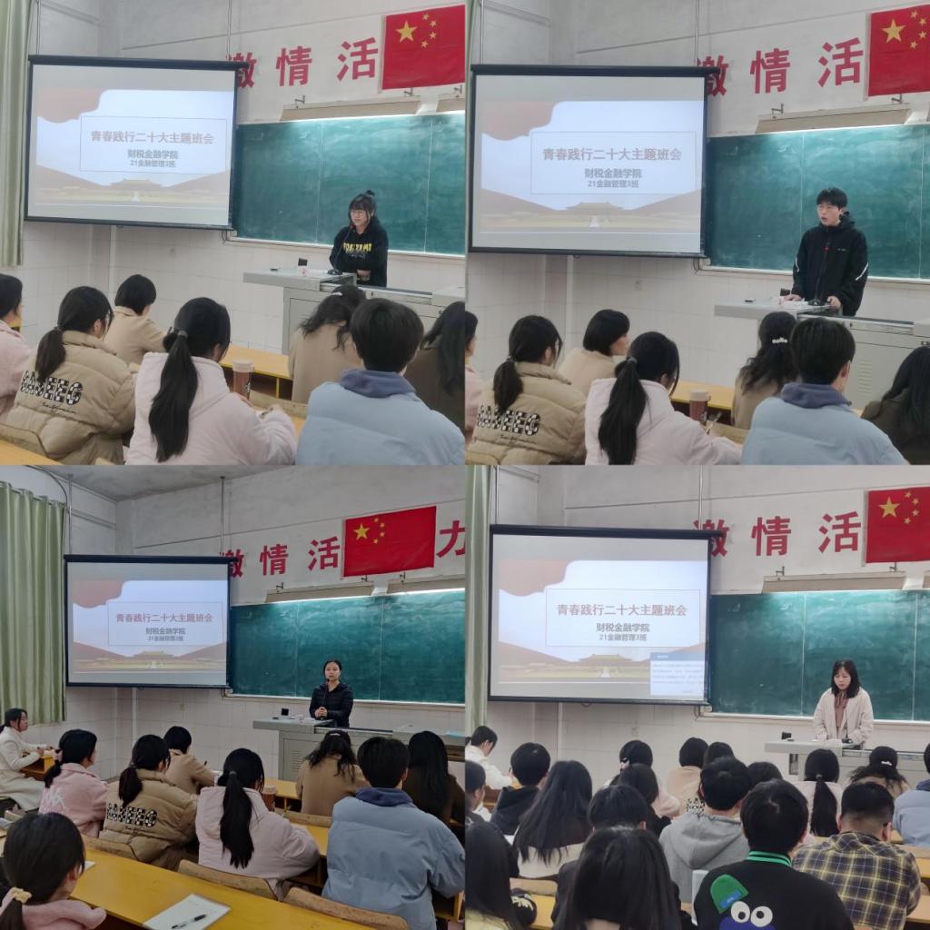 班会以“青春践行二十大”为主题,围绕“爱国、团结、奋斗、科学、互助”五个关键词,分享践行党的二十大精神、立志成长为新时代好青年的思考和实践。班会上,李莉、陈伟、张飞梅等同学结合党的二十大精神的学习,分享了自己对如何成为一名合格新时代青年的感悟。周加星、刘虹晗同学作为江西财经大学专升本联培项目的优秀学长学姐,从自身学习经历出发,鼓励学弟学妹们要树立远志,迎难而上。