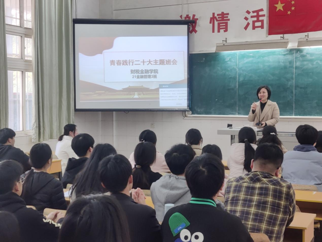 为深入学习贯彻习近平新时代中国特色社会主义思想和党的二十大精神,3月3日下午,校党委副书记、校长彭慧应邀参加财税金融学院21级金融服务与管理3班的主题班会。财税金融学院副书记王怡然、王能翔、副院长周莉、班主任黄晖雅以及21金融服务与管理3班全体同学参加了此次班会。