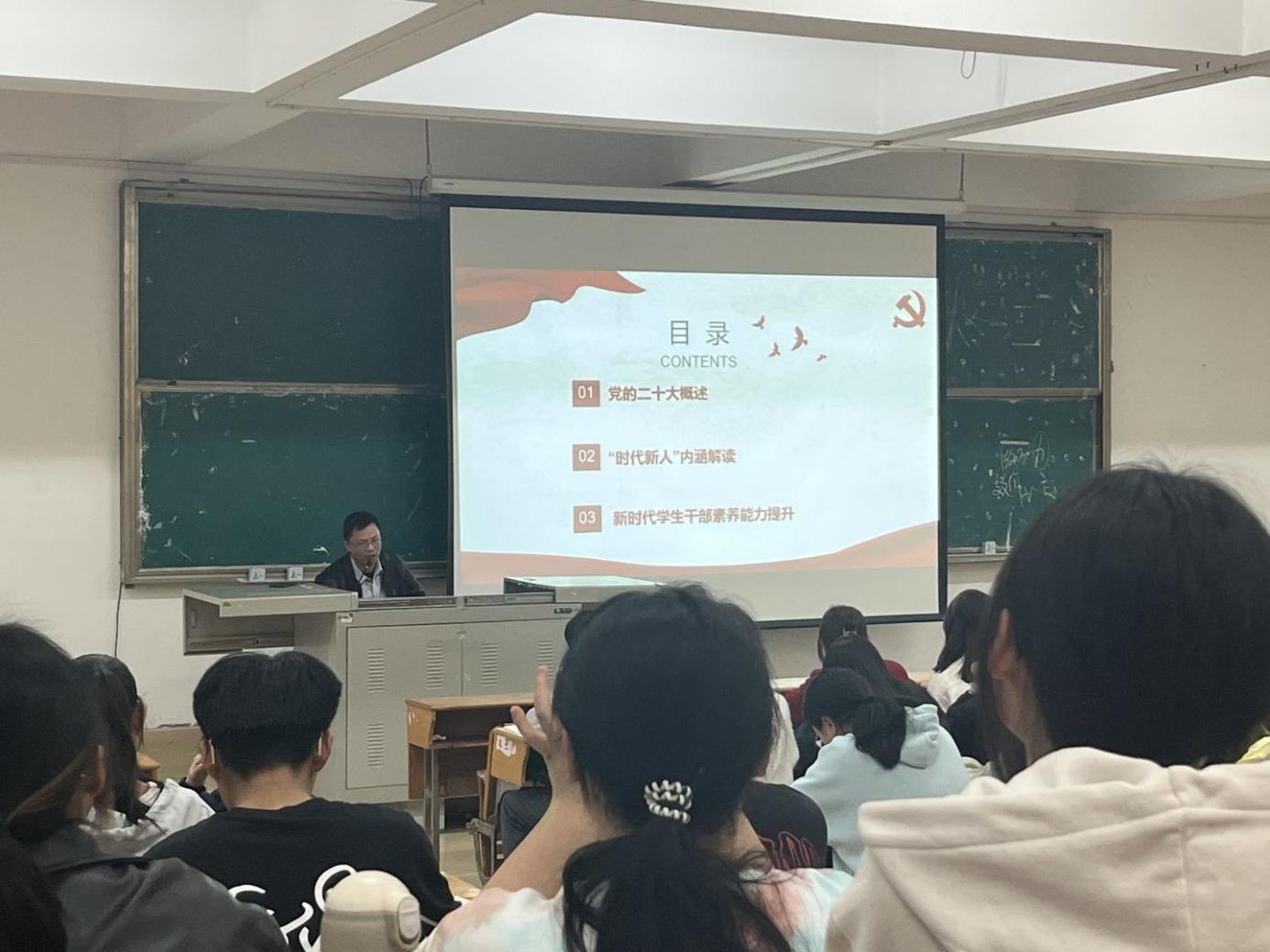 校党的二十大精神宣讲团成员、校团委副书记廖国臣以《青春遇见二十大 砥砺奋进向未来》为主题,从党情、国情、世情三个层面介绍了党的二十大召开的时代背景,从数字“1”“2”“3”“5”“6”角度讲解了党的二十大报告的重点内容,并紧扣党的二十大报告中关于“时代新人”的论述,从“有理想、敢担当、能吃苦、肯奋斗”四个方面解读了“时代新人”的内涵,最后从树立“一个宗旨”、厘清“两个关系”、强化“三个意识”、增强“四个素质”、提高“五个能力”等,交流了新时代团学干部素养能力提升的建议和要求。