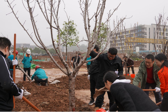 大家早早地来到八里湖新校区,在规划好的一片空地上紧张地劳动起来。大家拿起劳动工具埋头植树,有的挥锹挖坑、有的铲土填土、有的浇水,大家配合默契,经过辛勤的劳动,多棵樱花树“安家落户”。虽然有些劳累,但同志们都兴高采烈,仿佛已经看见我们的新校园绿树成荫、繁花似锦。