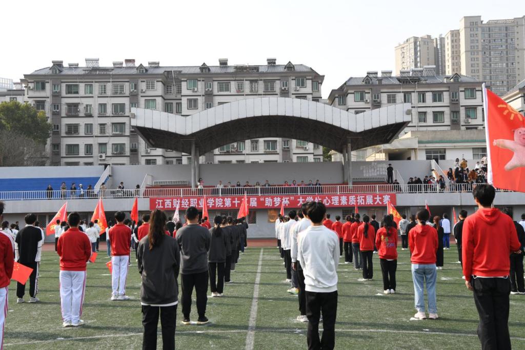 本次“助梦杯”大学生心理素质拓展大赛分为团队展示、素拓比拼和心理感悟三个环节。