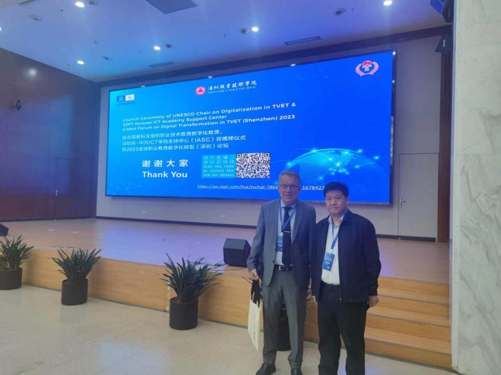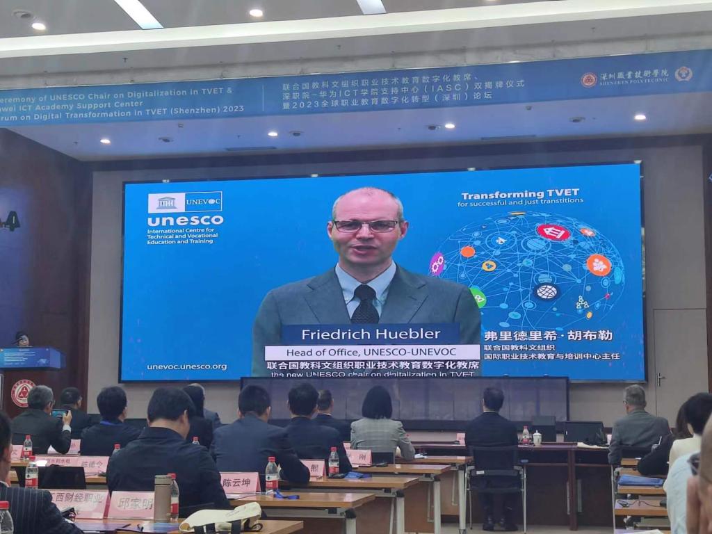 2023年3月16日上午,校党委书记刘彪文受邀参加联合国教科文组织职业技术教育数字化教席、深职院-华为ICT学院支持中心( IASC )双揭牌仪式,2023全球职业教育数字化转型(深圳)论坛系列活动。