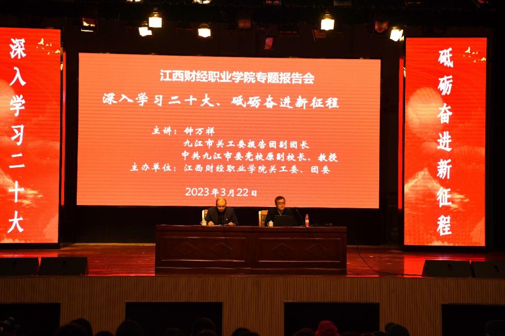 为深入学习贯彻党的二十大精神,帮助青年大学生更好地了解掌握党的二十大精神实质和丰富内涵,切实把青年大学生的思想和行动统一到党的二十大精神上来,3月22日下午,校关工委和团委联合在英才交流中心举办了党的二十大精神宣讲报告会,邀请九江市关工委报告团副团长钟万祥教授作了专题辅导报告,九江市关工委副主任、报告团团长王剑教授、校关工委部分成员和团委、学生会干部以及入团积极分子共计500余人参加了报告会。报告会开始前,校党委书记刘彪文,党委副书记、常务副校长何先应热情会见了王剑和钟万祥教授一行。刘彪文书记向他们介绍了bat365的发展建设情况,并对他们发挥“五老”专家的传帮带作用,热心奉献bat365关心下一代工作表示衷心感谢。报告会由校离退休工作处处长杨郁主持。