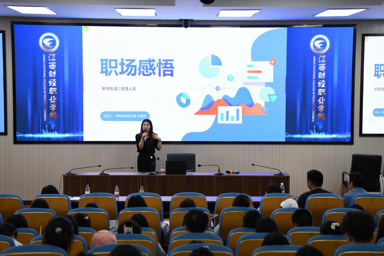 随后,2010届工商管理专业校友、杭州梦响电商总经理单国英带来首场讲座。她围绕个人“职场感悟”,以“初入职场——个人成长——个人感悟”为脉络,与同学们展开了热烈的互动交流。她以鲜活、丰富的案例阐述了初入职场会面临的问题,号召同学们明确事业目标、展现青年人的精气神,勉励学弟学妹培养“强责任、善学习、高要求”的能力素质,努力为人生积蓄更多底气。