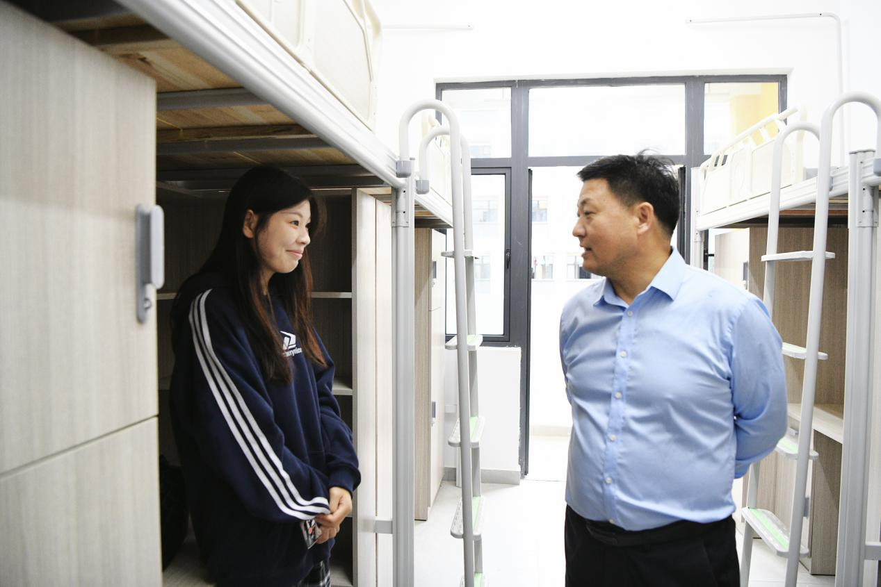 “你们从哪里来?”“报到过程中,有没有遇到什么困难?”“欢迎你加入财院大家庭。”校领导一行来到学生宿舍看望已报到注册新生,每到一间新生宿舍,校领导都与同学们进行了亲切交谈,了解新生家乡的情况及入学的感受,并希望新生们要尽快适应大学新环境,尽快投入到学习当中;要充分利用学校现有资源和学习环境,学好专业知识之余积极参加学校各项活动,勇于实践,不断提升自身应用能力和综合素质;要相互关爱,互帮互助,团结协作,共同度过美好的大学生活。