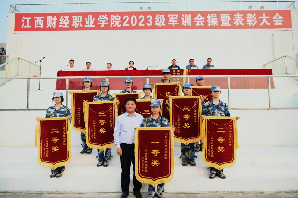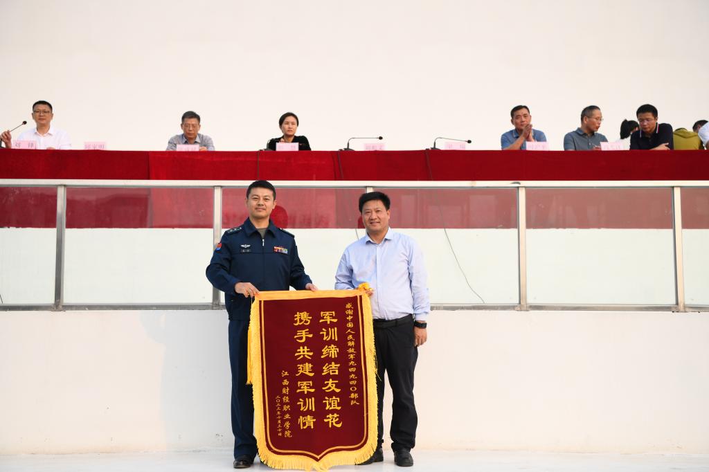 会操结束后,刘彪文代表学校向中国人民解放军某部赠送了锦旗,感谢部队对bat365军训工作的大力支持。校领导和部队首长还为军训获奖队伍颁发了锦旗,为获得2022-2023学年先进班集体的班级颁发荣誉证书。