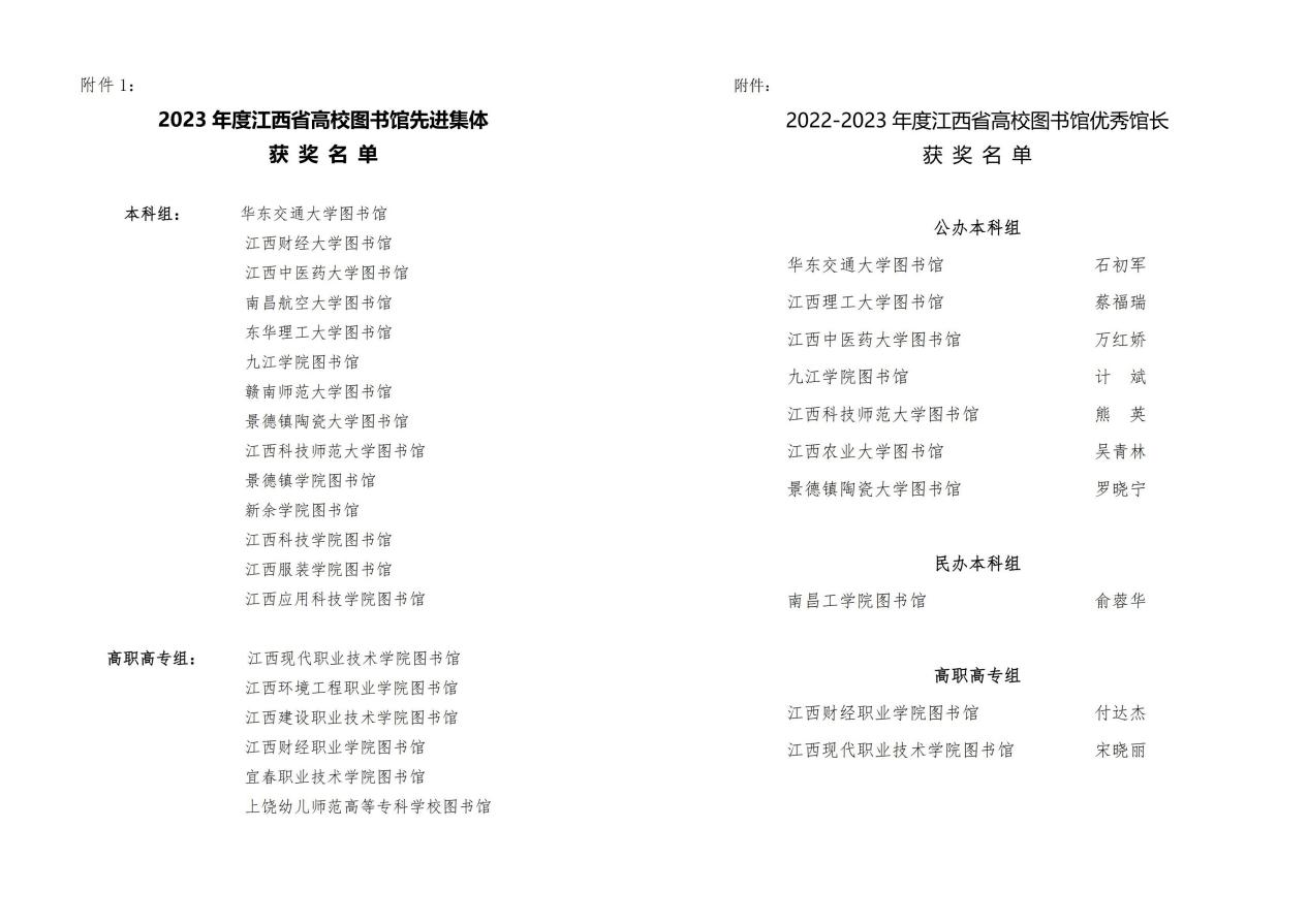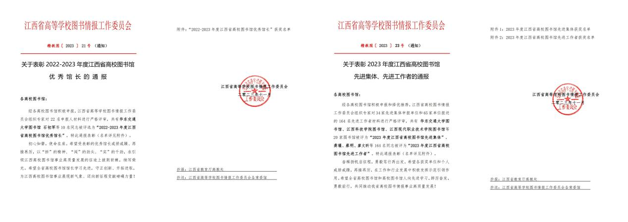 2023年11月8日,江西省高等学校图书情报工作委员会下发了《关于表彰2023年度江西省高校图书馆先进集体、先进工作者的通报》(赣教图〔2023〕23号)和《关于表彰2022-2023年度江西省高校图书馆优秀馆长的通报》(赣教图〔2023〕21号)。bat365获评2023年度江西省高校图书馆先进集体,全省仅6所高职高专院校获此荣誉。bat365图文信息中心主任付达杰同志获评2022-2023年度江西省高校图书馆优秀馆长。图文信息中心丁晓英、李鹏同志荣获江西省高校图书馆先进工作者荣誉称号。
