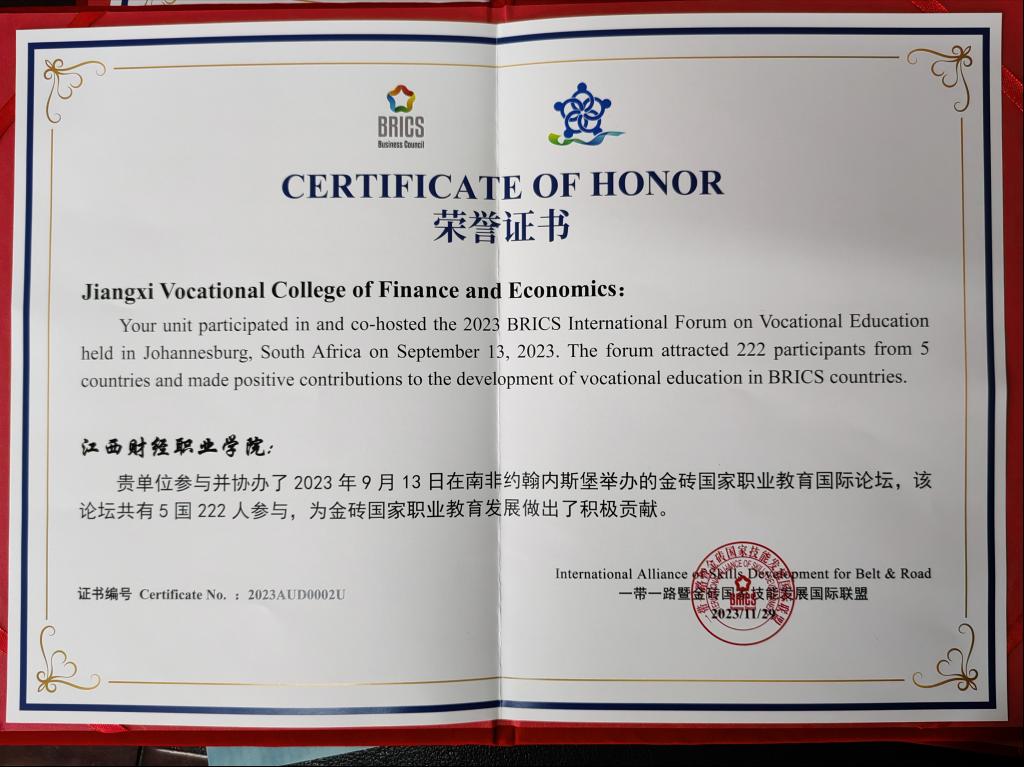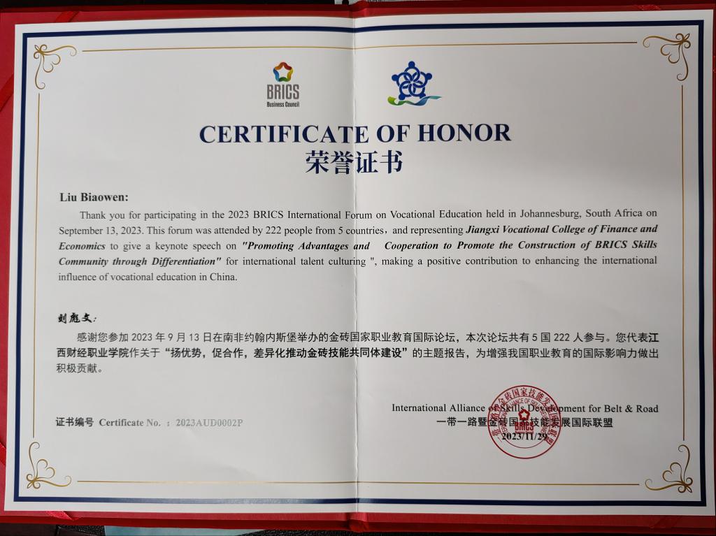 会上,四川财经职业学院党委书记张华为大会致辞,她首先对与会嘉宾的到来表示热烈欢迎。她表示,国际化既是高校迈向世界、走向卓越的必由之路,也是提升高等教育发展质量的重要途径,希望本次会议能为数智财经高等教育搭建良好平台,为财会专业的国际化发展贡献更多的力量。会议听取了“以中国标准引领金砖+教育”“‘机器学习与大数据’金砖国家国际团体标准建设经验分享”等报告、委员会2023年工作成果及2024年主要工作安排。会议还汇报了2023年金砖国家(南非)职业教育论坛开展情况,并对为金砖国家职业教育发展事业作出重大贡献的单位和个人进行表彰,bat365和校党委书记刘彪文获此殊荣。
