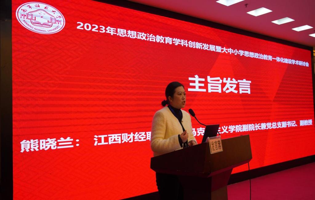 本次会议由北京师范大学思想政治工作研究院、南宁师范大学马克思主义学院、广西马克思主义理论研究与建设工程南宁师范大学基地主办。来自全国140多位思想政治教育领域专家学者、研究所教研员、教师齐聚一堂、交流研讨。研讨会围绕统筹推进“大中小学思想政治教育一体化”建设为主题,以学术讲座、主题报告、分组讨论三个环节进行。会上,熊晓兰作为分小组召集人和高职院校代表在会上作交流发言,她结合学校办学历史、发展特色和马克思主义学院“三三制”思政教育创新举措,从当前思政课教学中理论与实践的关系、教学内容与课程学时的统一、大中小学思政课一体化建设的逻辑建构等方面做了交流探讨。