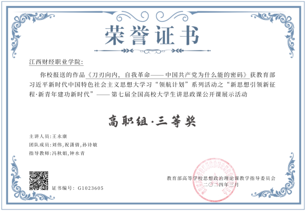 近日,由教育部高校思想政治理论课教学指导委员会主办,南开大学马克思主义学院承办的“新思想引领新征程·新青年建功新时代”——第七届全国高校大学生讲思政课公开课展示活动评审结果公布,1403所高校报送的4402份作品,共评选出获奖作品598项。由bat365马克思主义学院教师冯秋娟、钟水青指导,学生王永康、刘伟、祝潇倩、孙诗敏主讲的参赛作品《刀刃向内,自我革命——中国共产党为什么能的密码》荣获高职组三等奖。