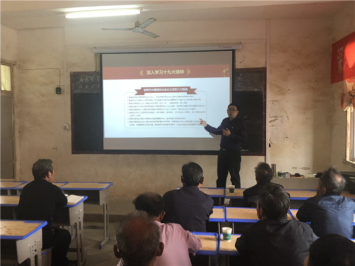 黄老师来到在bat365援建桥岭村的多媒体教室给全村党员上了一堂“学习贯彻十九大精神 提振乡村经济发展”主题党课,党课由驻村第一书记韦应珠主持。