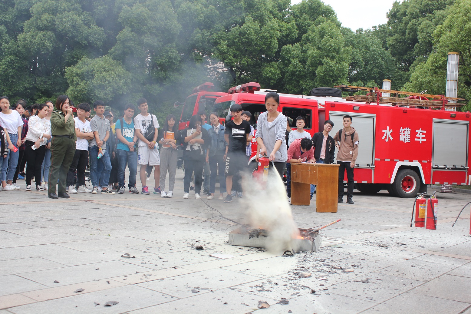 5月12日是我国第十个防灾减灾日,为普及全民防灾减灾知识,增强学校师生的消防安全意识,提高应急疏散能力, 5月10日下午,安全保卫处联合九江市浔阳区消防大队在学校东门广场举行消防安全演练活动,200余名师生参加演练。