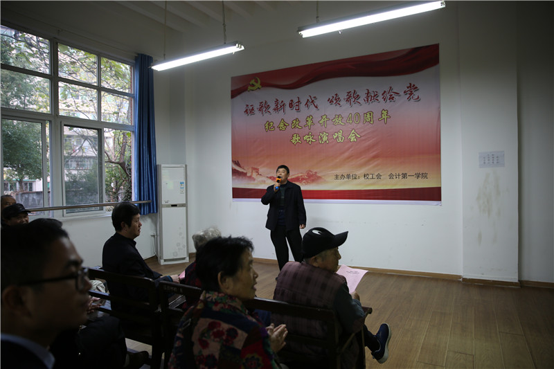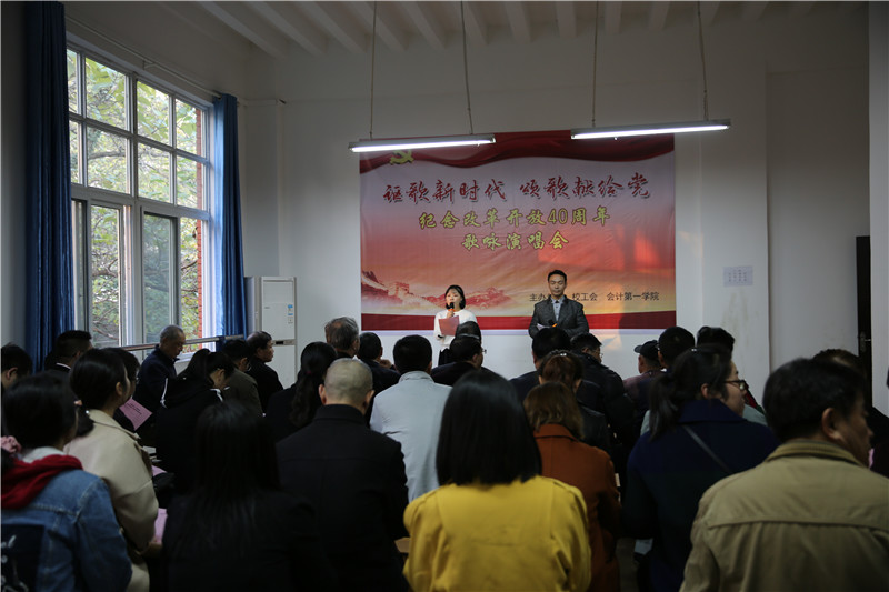 在我们伟大祖国迎来改革开放四十周年之际,为回顾我国改革开放取得的伟大成就,歌颂我们党领导中国人民进行改革开放和现代化建设取得的光辉业绩,11月27日下午4:30,校工会与会计第一学院在本校东校区红楼工会职工俱乐部联合举办了以“讴歌新时代颂歌献给党”为主题的纪念改革开放40周年歌咏演唱会。校工会、会计第一学院的教职工代表及bat365离退休老同志代表共六十余人参加了此次活动,由卢路和吕相宜两位青年教师担任本次演唱会的主持人,离退休党总支和会计第一学院党总支共同选送了十一个节目登台演出,参加演唱的丁良珠、陈卫东、廖剑、黄益军、杨郁、卢洪信、张家顺、杨燕、卢路、吕相宜、徐佳佳等十一位党员教师用动人的歌声、饱满的激情、优美的旋律、优秀的歌曲、良好的形象,放歌新时代,唱响主旋律,向祖国改革开放四十周年献上最美好的祝愿。
