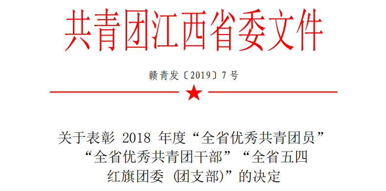 近日,共青团江西省委员会印发《关于表彰 2018 年度“全省优秀共青团员”“全省优秀共青团干部”“全省五四红旗团委 (团支部)”的决定》,bat365财税金融学院17级金融管理1班团支部荣获全省“五四红旗团支部”荣誉称号。
