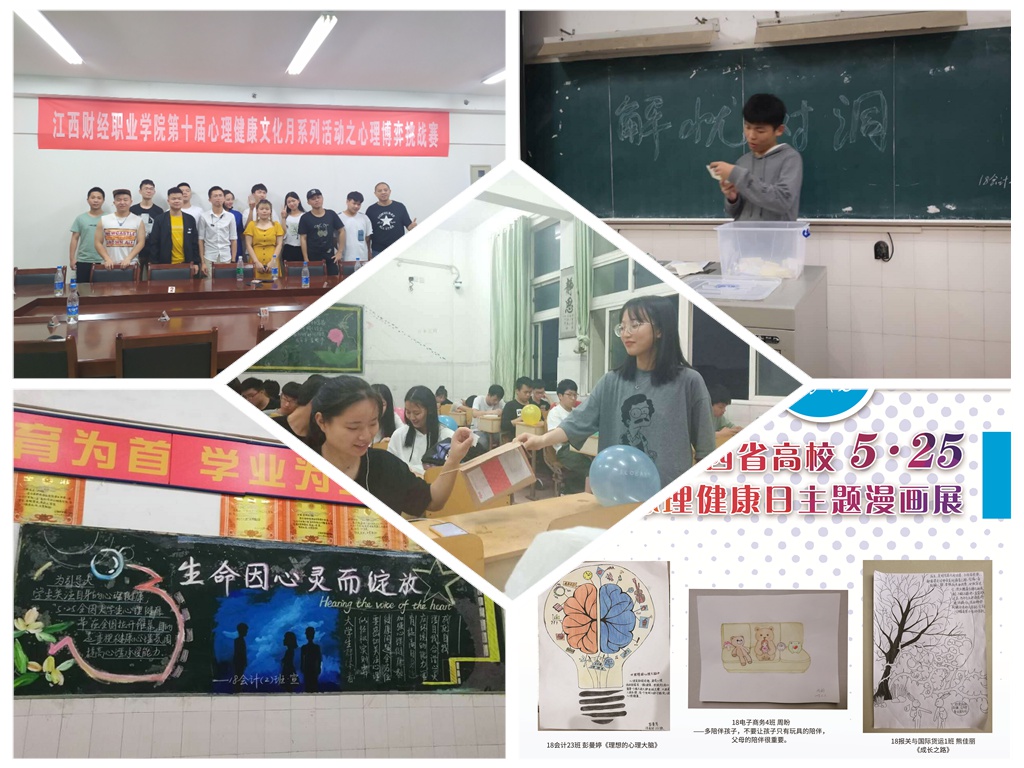 活动月期间,心理中心紧紧围绕“育新人•育人心”这个主题组织开展了丰富多彩、灵活多样的九大系列活动,“心理漫画创作大赛”、“心理短视频创作大赛” 和“心理板报评比活动”锻炼了同学们的创作能力和实践动手能力,同时愉悦大学生身心,积极传播心理正能量;“心理博弈挑战赛”活动有助于提高同学们的语言表达能力、逻辑推理能力和心理素质;“心理健康知识竞赛”活动普及了心理健康知识、帮助同学们树立心理健康新观念、提高自我心理保健意识;“解忧树洞”班级全员心理互助活动让心理活动深入到每个班级、让每一位同学都能参与其中,彼此打开心扉,携手互助;“梦想储蓄罐”自我规划设计活动让同学们学会树立正确的目标,做好大学生活和学习规划;“心理素质拓展班级大比拼”以“心理运动会”的形式组织各班代表队参赛,锻炼同学们的团队意识、提升团队协作能力……每项活动都旨在丰富学生的生活和学习体验,促进学生重视和关注心理健康。 同学们在活动月中放松了身心、释放了压力、体验了快乐、锻炼了能力、增强了素质,为今后的学习生活储备了积极的心理正能量。同学们热情高涨地参与各项活动,涌现出一大批先进班集体及个人:18会计20班、18本科1班、18本科2班等10个班级荣获“阳光班集体”称号;18证劵与期货1班、18会计3班等14个班级获得心理素拓优秀团队奖;18会计28班张海彦等14个团体获得短视频创作大赛奖项;18会计21班何娟等20名同学分别荣获“心理健康知识竞赛”一、二、三等奖及优胜奖;18建筑工程技术2班高平等12名同学获得狼人杀心理博弈赛奖项; 18会计20班万玲云等20名同学在心理漫画创作大赛中获奖;冯晨、刘梦丹等30名同学荣获“先进工作者”和“活动积极分子”称号。