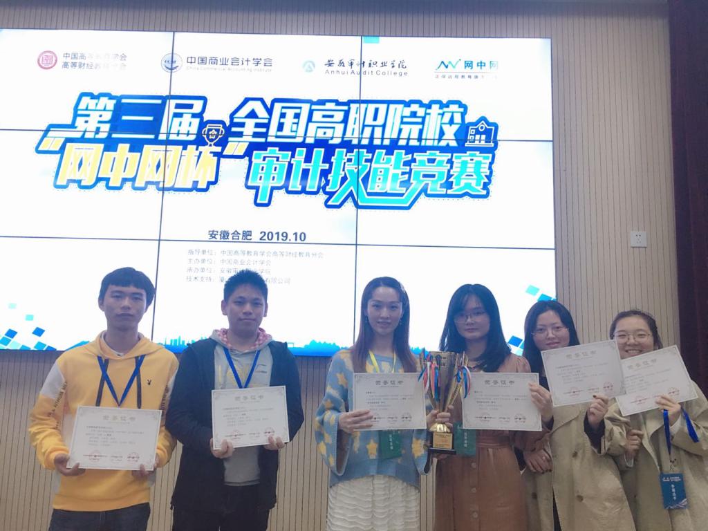 2019年10月26日,由中国高等教育学会高等财经教育分会主办、安徽审计职业学院承办的2019年第三届全国高职院校“网中网杯”审计技能竞赛在安徽审计职业学院举行。来自全国各地的35支代表队参加了本次赛事。bat365正版唯一官网会计第二学院由吴菁菁、黄迎两位指导老师带领着王璐瑶、付泽岩、汪冰琪、郑旺亚四位同学参赛。经过激烈的角逐,bat365代表队在比赛中脱颖而出,以总分637.65分的优异成绩位列全国第一,荣获一等奖,吴菁菁、黄迎两位老师荣获“优秀指导教师”称号。其中,审计理论单项比赛全国140名选手仅有13名成绩达到80分以上,bat365四位同学均位列其中,王璐瑶同学高达89分;不仅如此,付泽岩同学在审计实务单项比赛中以90分的优异成绩位列全国第一。