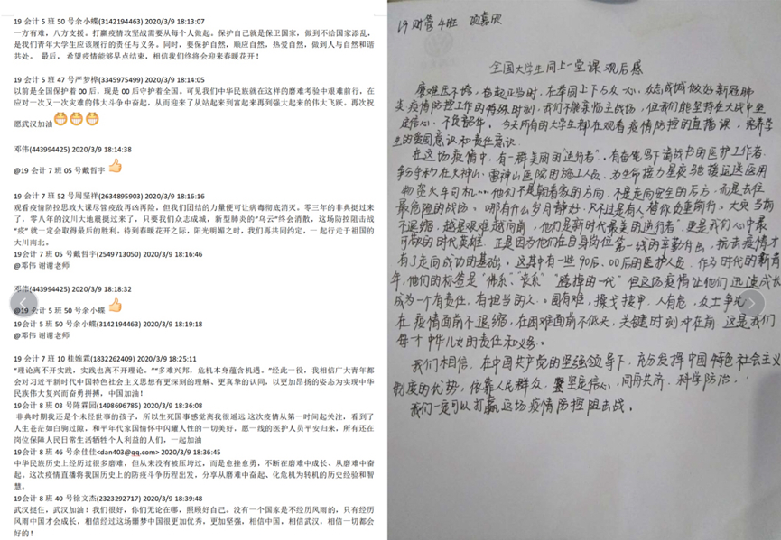 广大学生围绕战“疫”的青年担当展开了热烈讨论。会计第一学院2017级会计21班学生朱登表示,作为一名即将毕业的学生,要把这次“大课”中的所学所得转化为为伟大祖国努力工作的动力,把抗“疫”中涌现出来的伟大奉献精神作为自己走上职场的指针。2018级网络营销班学生李浩说:“听完‘大课’后,深深认识到自己的祖国是多么的强大团结!疫情期间,我们虽然不能上战场,但我们响应号召宅在家,不给社会添乱,这也是我们的担当。”会计学2019级1班喻晶晶表示抗“疫”体现了中国特色社会主义制度的优越性,一方有难,八方支援,当武汉物资资源极其缺乏的时候,其他各省都尽其所能为武汉提供支援和帮助,在这中也看到了医护人员的伟大与他们的无私奉献,作为青年的我们应该学好自己的知识,努力奋斗成为合格的中国特色社会主义接班人。