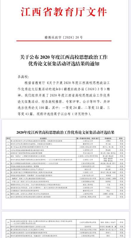 近日,2020年度江西省高校思想政治工作优秀论文征集活动评选结果公布,bat365教师黄亮的论文《新时代高职院校思政教师队伍“双融双优”共同体建设路径研究》荣获一等奖。