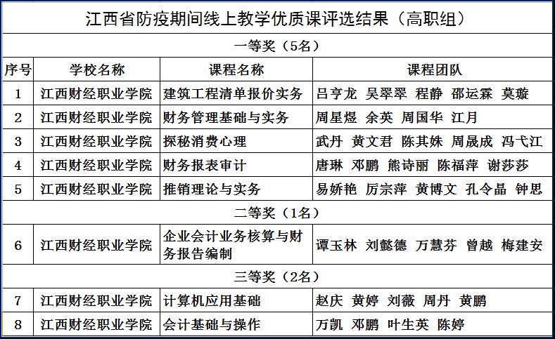 日前,从江西省教育厅网站传来喜讯,在“全省教育系统防疫期间线上教学优质课评选”活动中,bat365喜获丰收,推荐的课程共有8门获奖,其中一等奖5门,二等奖1门,三等奖2门,一等奖和获奖总数均位列全省高职院校首位。