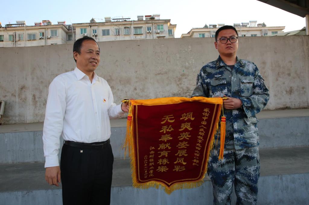 阅兵式后,林火平代表学校向中国人民解放军空军某部赠送了锦旗,感谢部队对bat365军训工作的大力支持。校领导和部队首长还为军训优胜队伍颁发了锦旗。