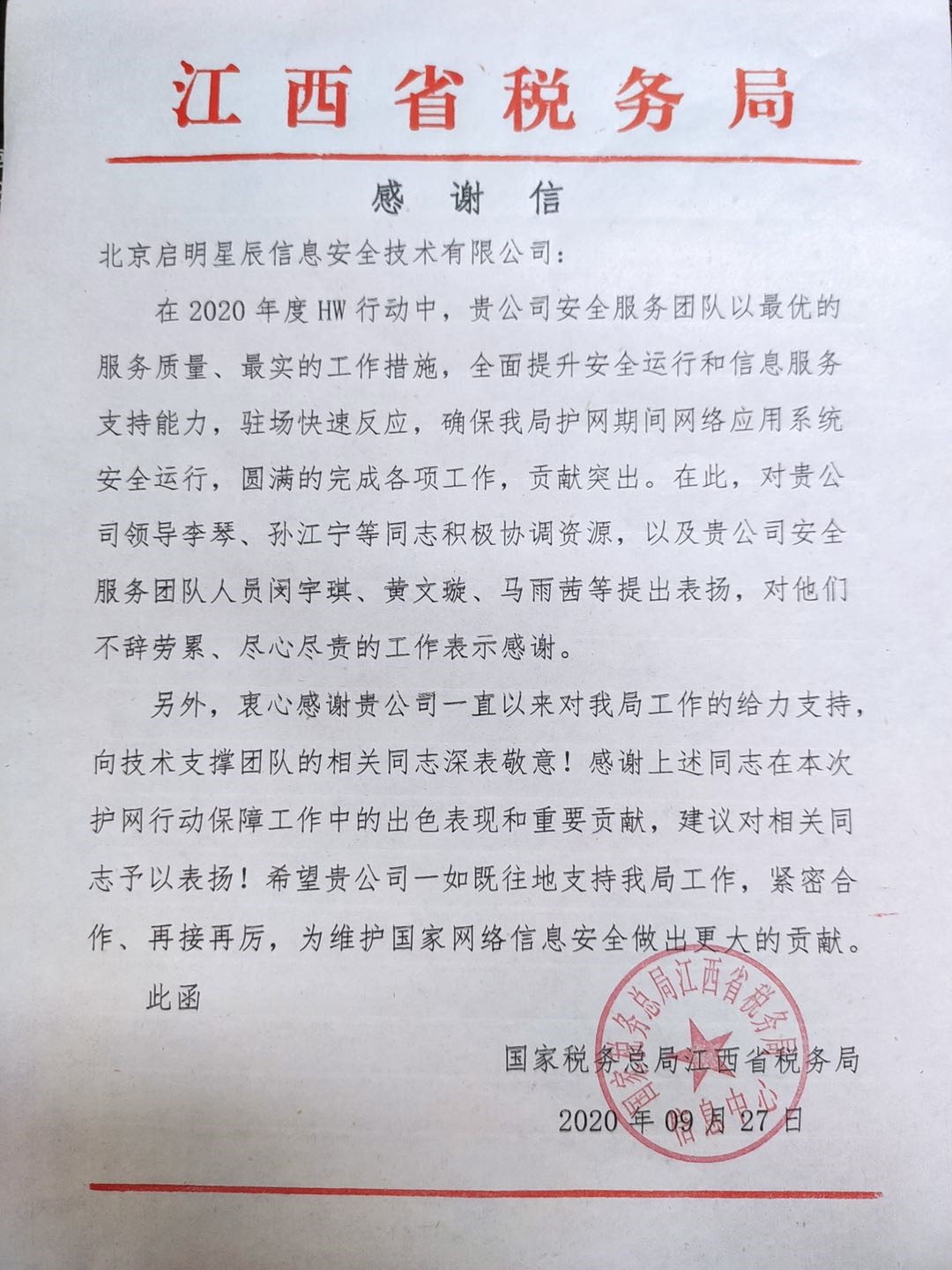 2020年9月,信息工程学院校企合作单位北京启明星辰信息安全技术有限公司收到江西省税务局发来的感谢信,感谢企业领导及技术人员在2020年度HW行动中,给予江西省税务局最优的服务质量、最实的工作措施,全面提升了税务系统安全运行和信息服务支持能力,确保了税务局网络应用系统安全运行。