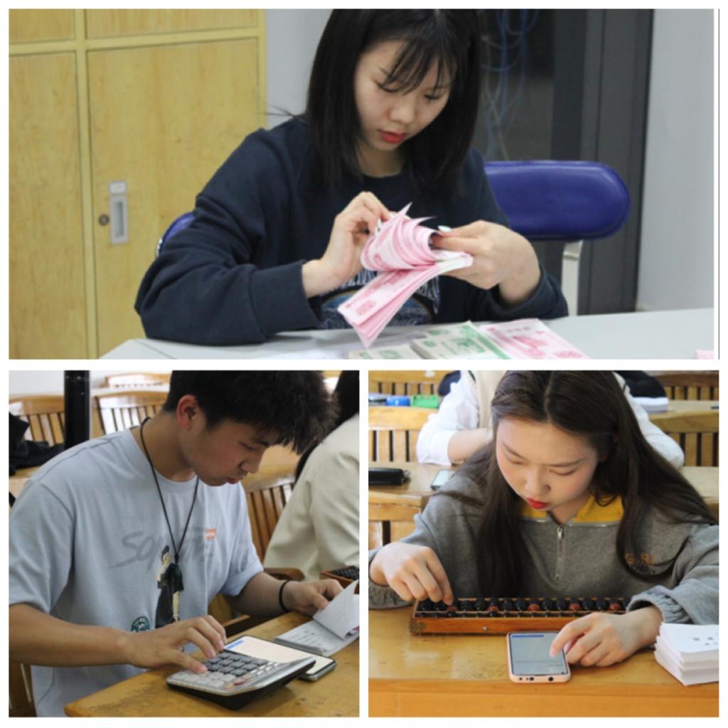 点钞技能竞赛与会计省赛,国赛接轨,采用定时清点的规则。要求同学们在五分钟内对100、50、20、10四种不同面值且不同数量的十把练功券进行清点。比赛中,“刷刷”的点钞声清脆悦耳,同学们用单指单张、多指多张、手按式多指等点钞方法完成清点,展示了同学们良好的专业素养。