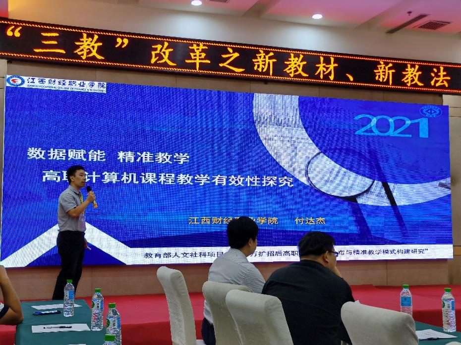 信息工程学院选派陈荣华副教授及行政兼课教师图文信息中心主任付达杰教授参会。作为CCF VC委员,付达杰教授应邀在大会分论坛六——“三教”改革之新教材、新教法做主题为“数据赋能 精准教学 高职计算机课程教学有效性探究”的精彩演讲,并作为嘉宾受邀上台就“三教改革的难点与突破点在哪里?”及“如何实现教材与教法的有机结合”两个话题与台上台下专家学者和听众积极互动,付达杰教授提出的有关观点受到与会专家和学者一致好评。