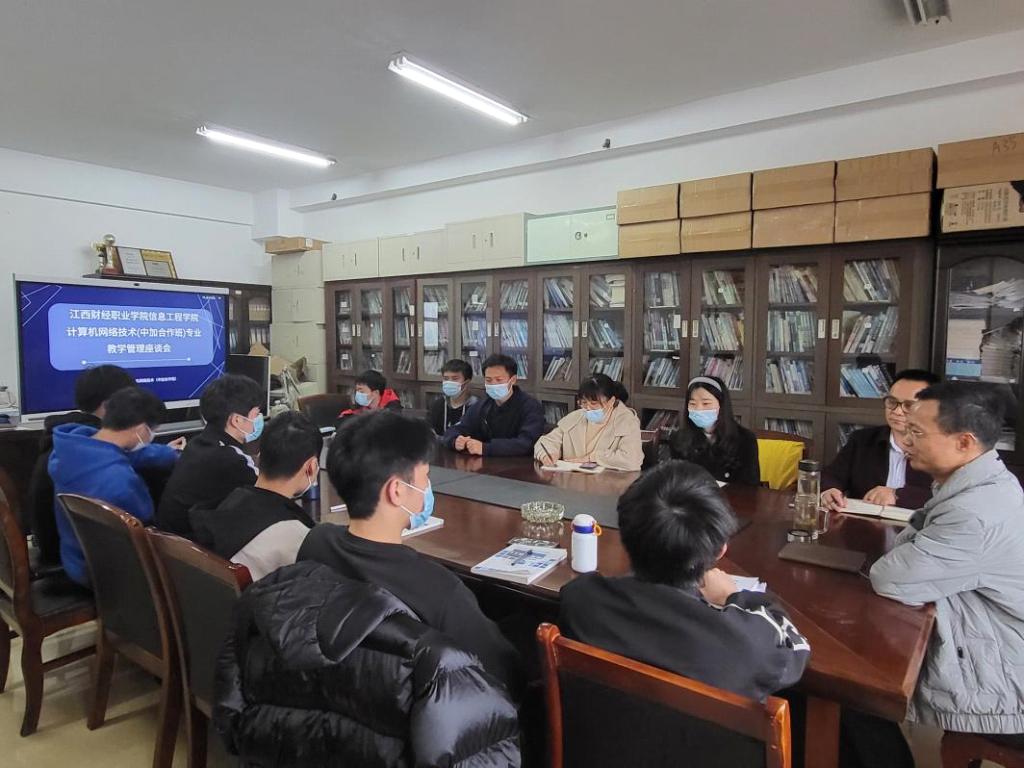 3月31日下午,信息工程学院在综813办公室召开了计算机网络技术专业中加合作班教学管理座谈会。会议由信息工程学院副院长陈荣华主持,院长易文泉、计算机网络技术专业负责人熊娟老师、班主任周逸寒老师及计算机网络技术专业中加合作班全体学生出席了座谈会。