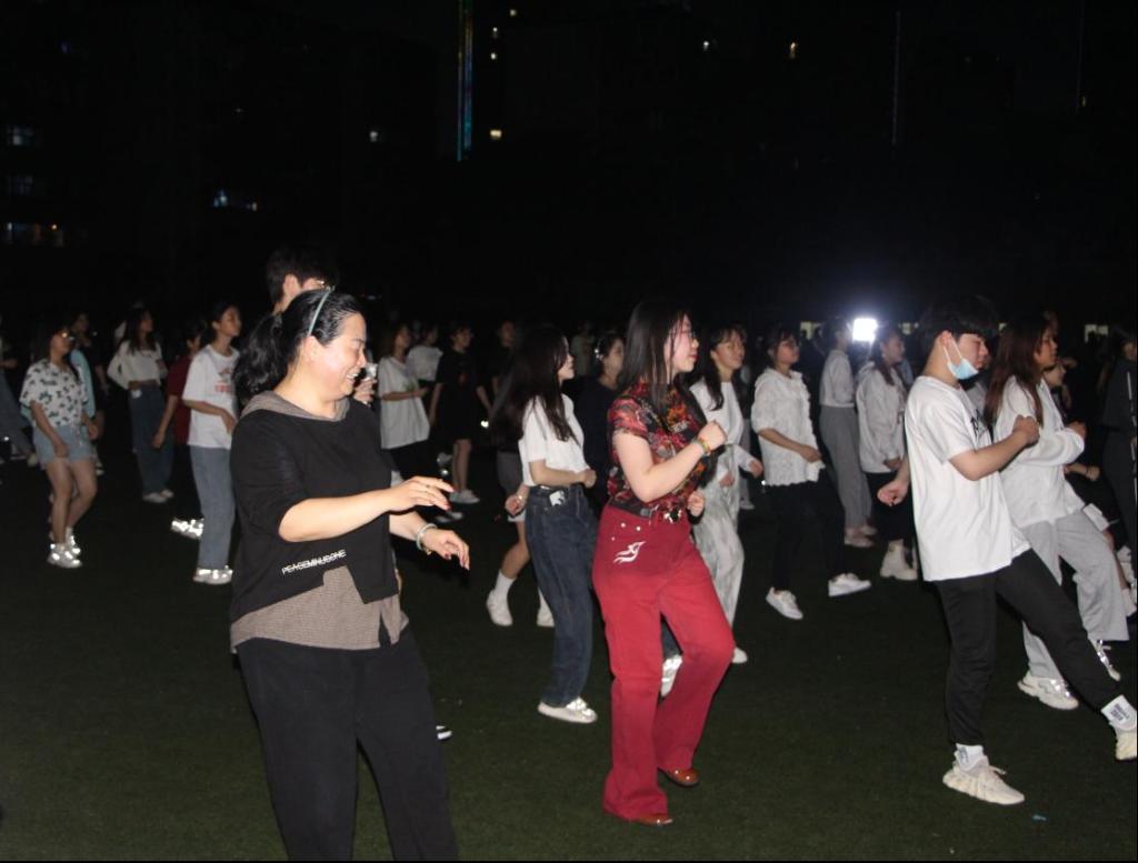 每周五、周六晚7点,数字经济学院“舞出健康 舞出快乐”广场舞活动在田径场如约举行,根据疫情防控规定,同学们保持一米间距有序列队,短暂的热身活动结束后,广场舞正式开始。在领舞同学的带动下,随着音乐的播放,同学们时而激情澎湃、铿锵有力,时而温柔婉转、婀娜多姿,现场的热情感染了在场观看的其他师生,他们相继加入其中,享受舞动的快乐,释放青春的热情。