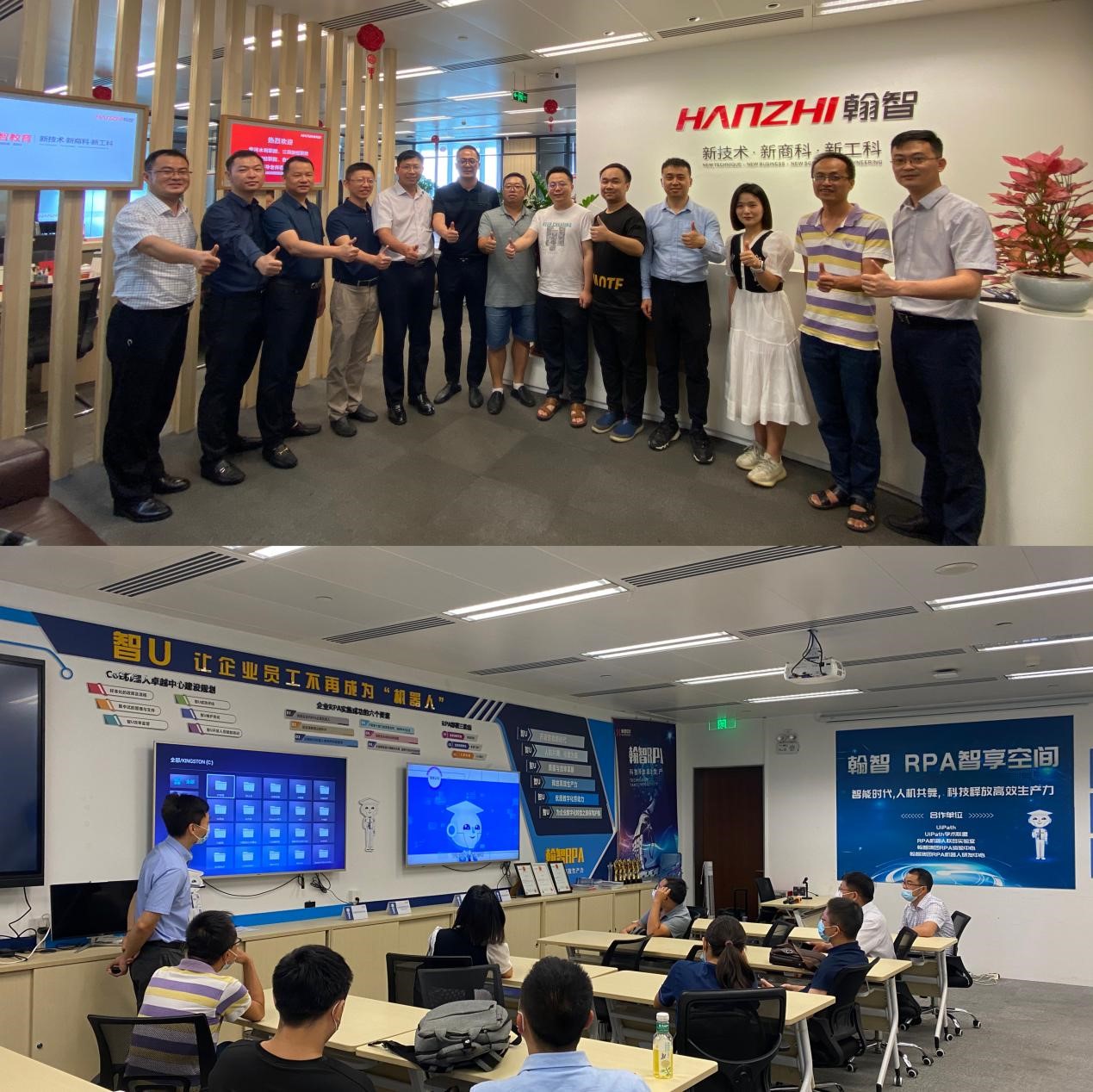 首先,翰智数科营销总监方樯带领大家参观了公司的办公区、培训基地与研发中心,方总介绍了翰智数科的发展历程、业务板块、企业数字化发展、智能化应用实践、产教融合的成功案例,并通过视频展示了企业RPA机器人在各行各业中的应用场景。
