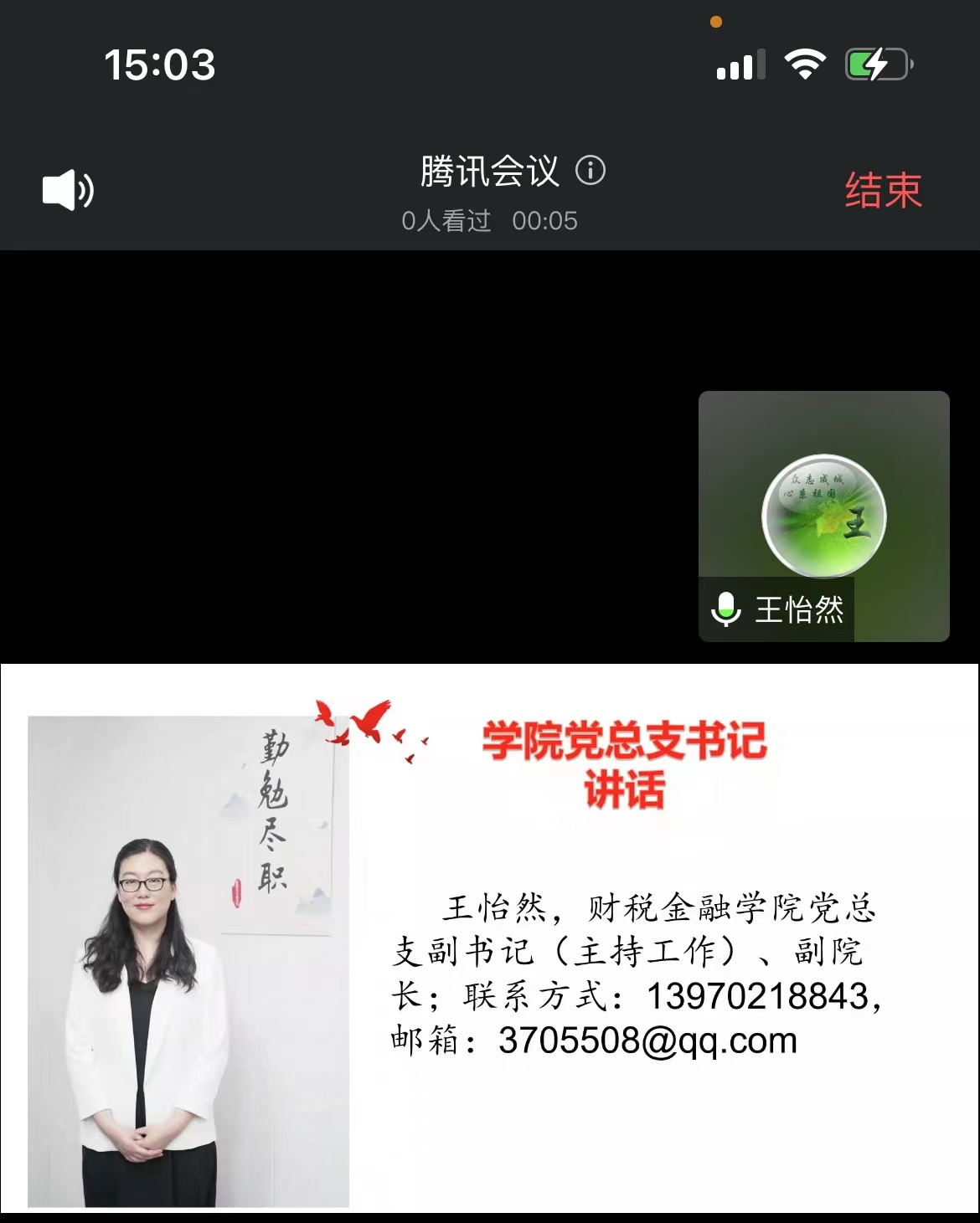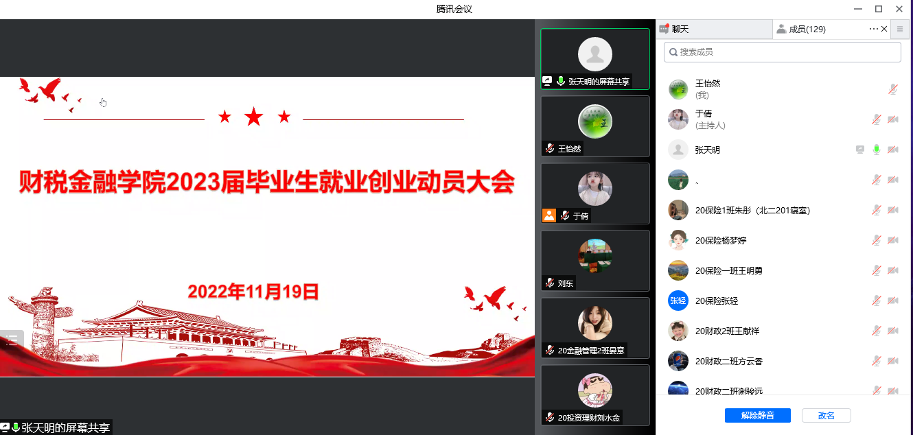 为扎实推进2023届毕业生就业指导工作,帮助毕业生认清就业形势、把握就业机会,实现充分、高质量就业,财税金融学院于11月19日下午通过腾讯会议在线召开了2023届毕业生就业创业动员大会暨就业创业培训会。学院党总支副书记(主持工作)、副院长王怡然和全体毕业班班主任,以及2023届全体毕业生共计360余人参加会议。会议由学院党政办公室主任张天明主持。