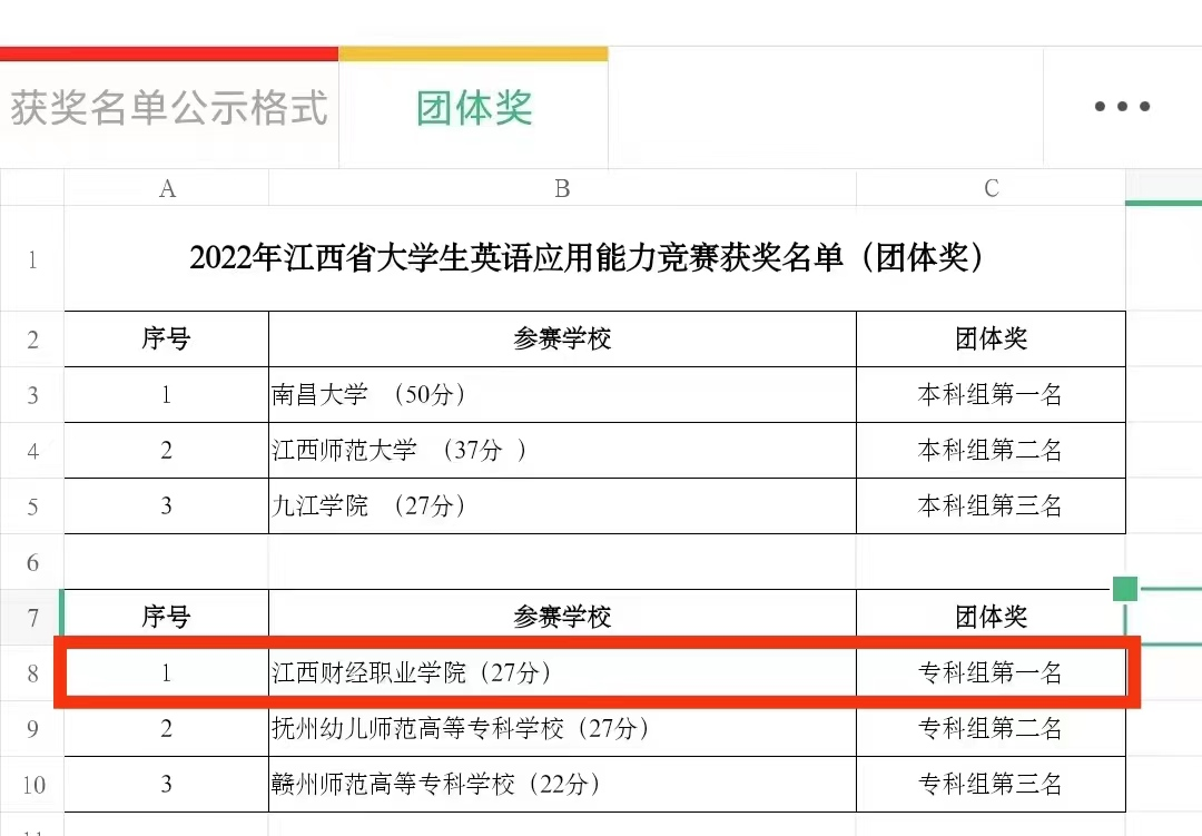日前,省教育厅网站正式公布了2022年江西省大学生英语应用能力竞赛获奖名单。根据团体总分的积分规则,bat365凭借一等奖2项,二等奖1项,三等奖1项的好成绩,共获得团体总分27分,位列全省专科组第一名。