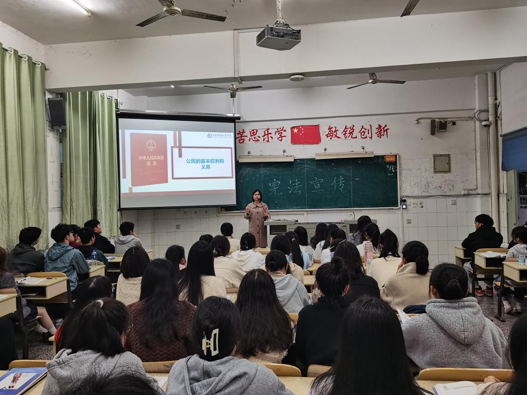 马克思主义学院虞欢老师为同学们详细介绍了什么是宪法、宪法的起源、颁布的背景、宪法的主要内容、国家宪法日的设立等,深入浅出阐释了宪法的历史沿革、基本构成、重要地位及重大意义。整个授课过程,学生们听得津津有味,并且积极踊跃回答问题,普法课堂气氛热烈。活动结束后,师生们纷纷表示此次普法活动不仅丰富了校园法治文化,更进一步增强了同学们自觉知法、懂法、守法、护法的责任意识,进一步推动法治校园建设。