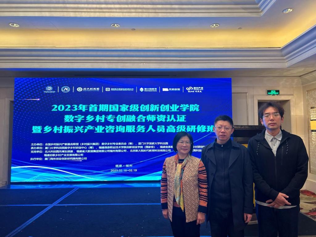 为进一步推进bat365正版唯一官网创新创业专项建设工作的开展,促进高校创新创业教师更新教学理念、改进教学方法、提升教育水平,2023年2月18日-19日,bat365正版唯一官网数字经济学院副院长谭宏及数字经济专业建设小组章清教授、陈石博士一行赴福州参加首期国家级创新创业学院数字乡村专创融合师资认证暨乡村振兴产业咨询服务人员高级研修班线下培训。