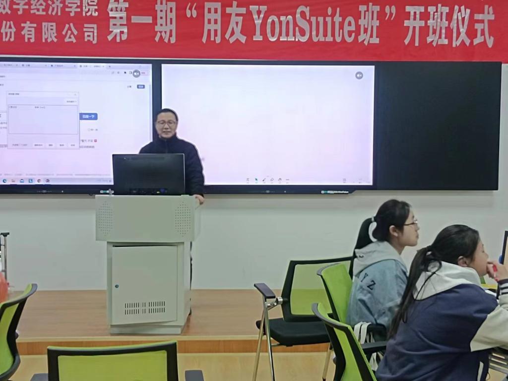 “用友YouSuite班”开设企业信息系统认知,供应链信息系统实施、管理信息系统客户化实施、实施方法论与项目综合实训、YonSuite云平台、YonSuite业财税档综合智能实训等8门课程,教学时长约11周,由用友公司北京总部桑大勇博士等企业专家来学校与bat365教师共同授课。