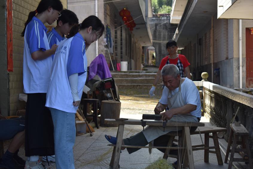 图为实践团队成员观看非遗传承人李爷爷破篾过程