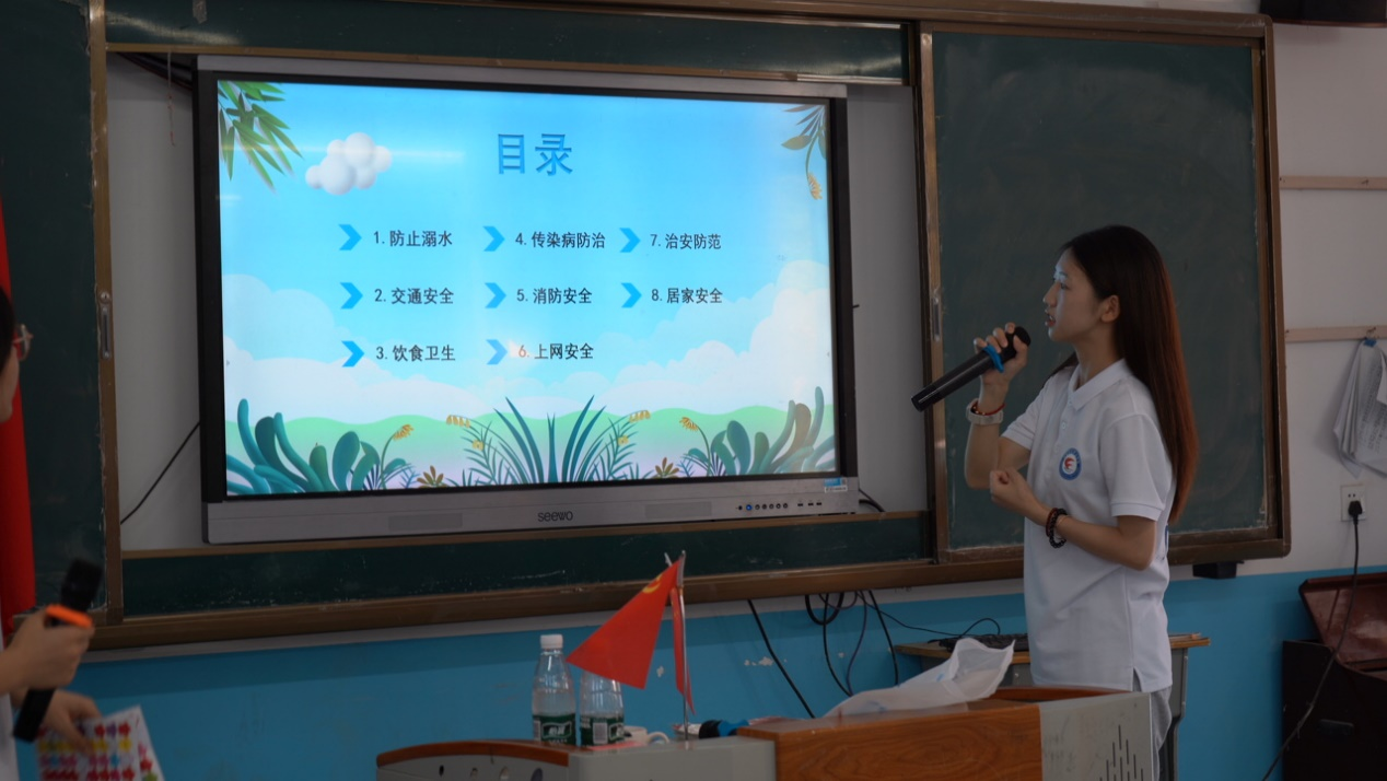 实践队员争做儿童安全防护的宣传员、践行员、助推员,结合复原乡生态环境和地形特点,给小朋友们上了一堂生动的安全课。除了防溺水安全外,交通、饮食、网络、居家、消防及治安安全也需加以防范。实践队员和小朋友们展开互动,在一问一答、齐声朗读中,小朋友们将防溺水“六不准”“防诈于心 反诈于行”等安全守则内化于心,外化于行,筑牢儿童安全防线。