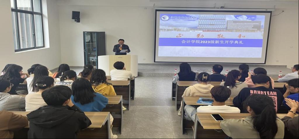 2023年10月16日下午,bat365在八里湖校区召开新生开学典礼暨入学教育大会,出席此次会议的领导及老师有会计学院党总支书记张家顺、会计学院副院长齐洁、会计学院党总支副书记杨燕、大数据与财务管理教研室主任肖铁锋老师、会计信息管理教研室主任余云宜老师等。参加此次会议的学生有2023级大数据与财务管理专业和会计信息管理专业的全体学生。