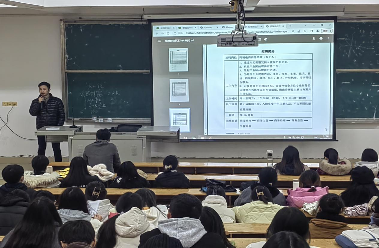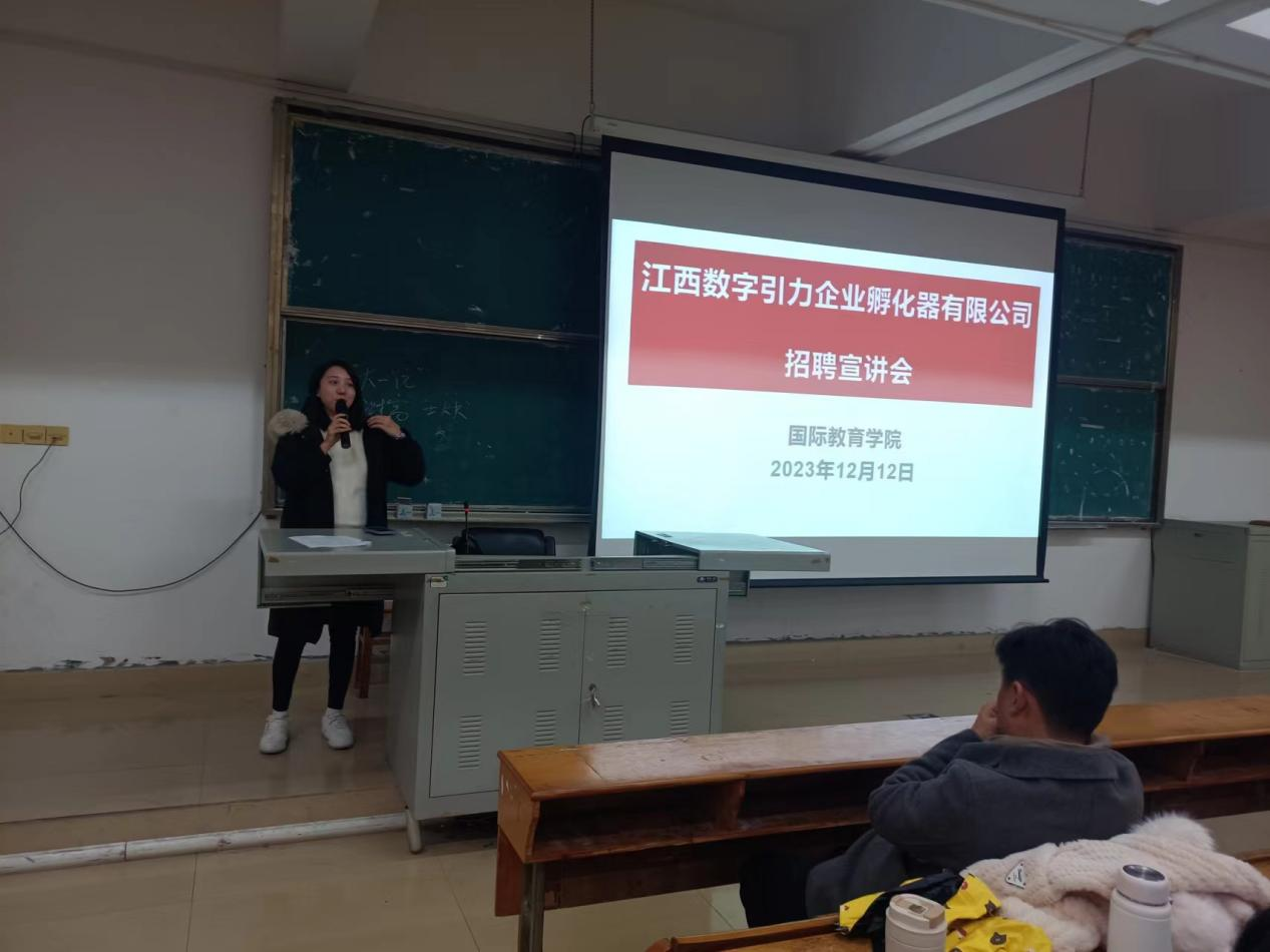 本次招聘宣讲会邀请了江西数字引力企业孵化器有限公司、九江半岛宾馆、昆山华泛信息服务有限公司三家企业,各企业负责人分别从企业概况、招聘岗位及职责、培训与晋升机制、薪资待遇等方面向同学们进行详细的介绍,并为毕业生提供了外贸订单员、外贸运营业务员、跨境电商商务助理、商务接待等岗位50多个。