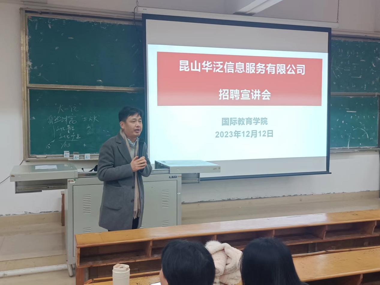 为做好2024届毕业生的就业工作,国际教育学院积极联系专业对口企业,努力为毕业生搭建就业平台。12月12日下午4点20,国际教育学院携手三家企业在综合阶梯5教室举办企业专场招聘宣讲会。此次招聘会由国际教育学院办公室主任王禾传主持,国际教育学院党总支书记王胜华同志、毕业班班主任以及2024届毕业生参加了此次招聘会。